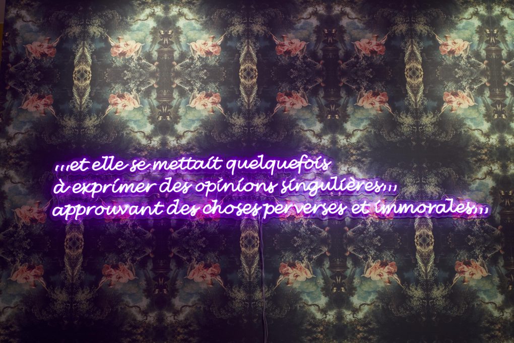 Pour incarner son propos, elle présente un mur recouvert de représentations florales auxquelles elle associe des vases. En effet, ce motif et cet objet font directement référence au fait qu’une femme puisse être déflorer.