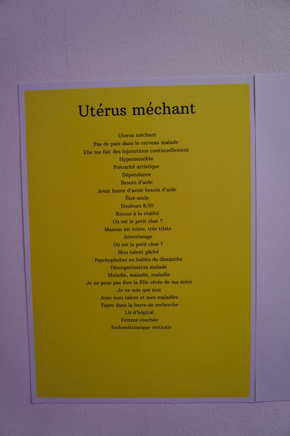 Huit artistes sont engagées dans ce projet. Il s’agit de Corinne Szabo, Ema Eygreteau, Enora Keller, HYSTERA dr Alicja Pawluczuk, Maëliss Le Bricon, Rachael Jablo, Nathalie Man et Nadia Russell Kissoon. Parmi elles, celles atteintes d’endométriose dénoncent un manque d’écoute de leur parole et de reconnaissance de leurs symptômes. Elles déplorent ainsi un diagnostic très tardif. Alors qu’elle souffrait depuis le début de son adolescence, Enora Keller a dû attendre ses 31 ans pour que la maladie soit reconnue. C’est en images, principalement en selfies, qu’elle documente son parcours de vie rythmé par les aléas, les contraintes et la souffrance.