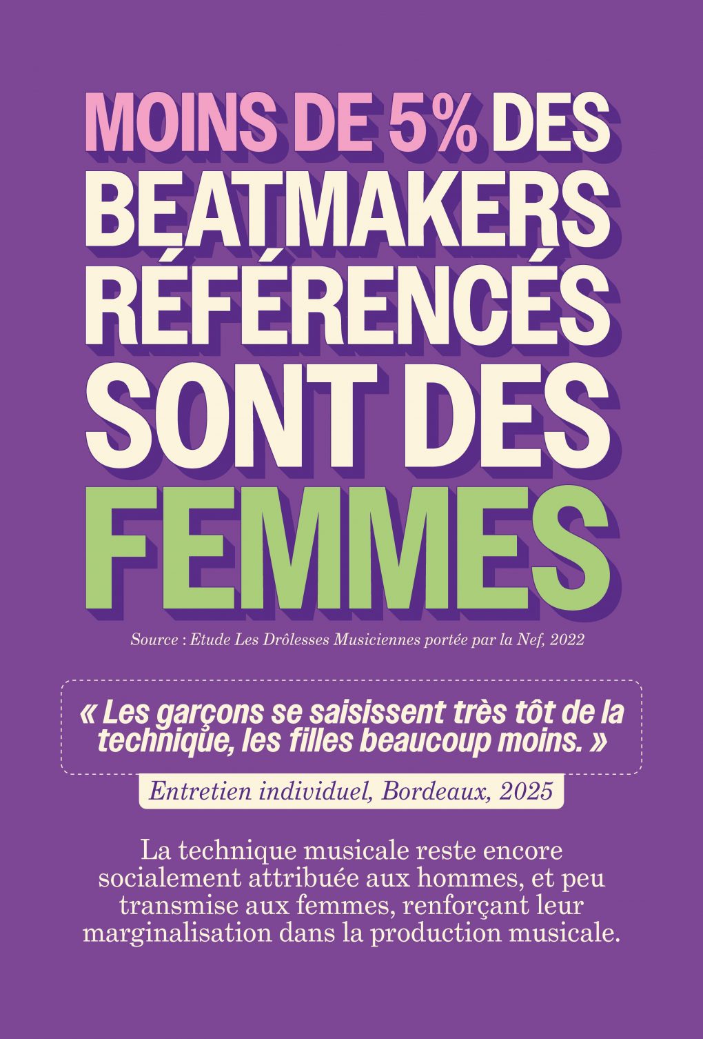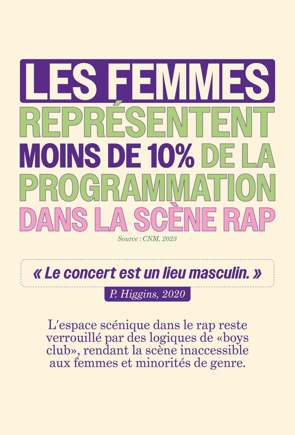 Le cœur du projet repose donc sur un rapport d’enquête répondant à une question centrale : quelle place les figures féminines occupent au sein de la scène rap française depuis dix ans ? Mené par Yelena Kohe, le rapport Reconfigurations et (in)visibilité des femmes dans le hip hop français révèle des chiffres à travers des infographies parlantes. On peut par exemple citer qu’en 2022, seulement 14 % des artistes programmé·es dans les festivals français sont des femmes, ou encore que moins de 5 % des beatmakers référencés par l’étude sont des femmes.